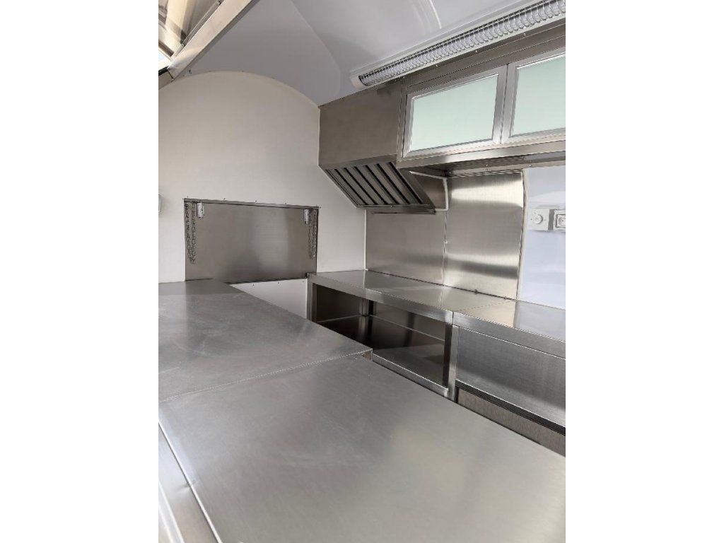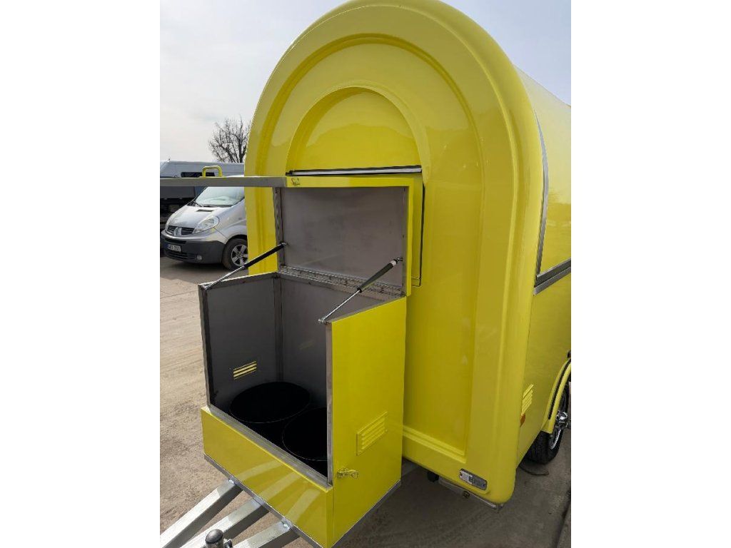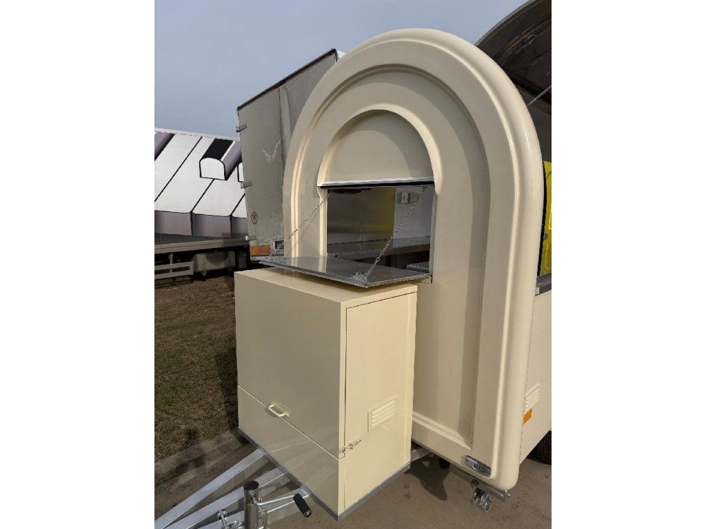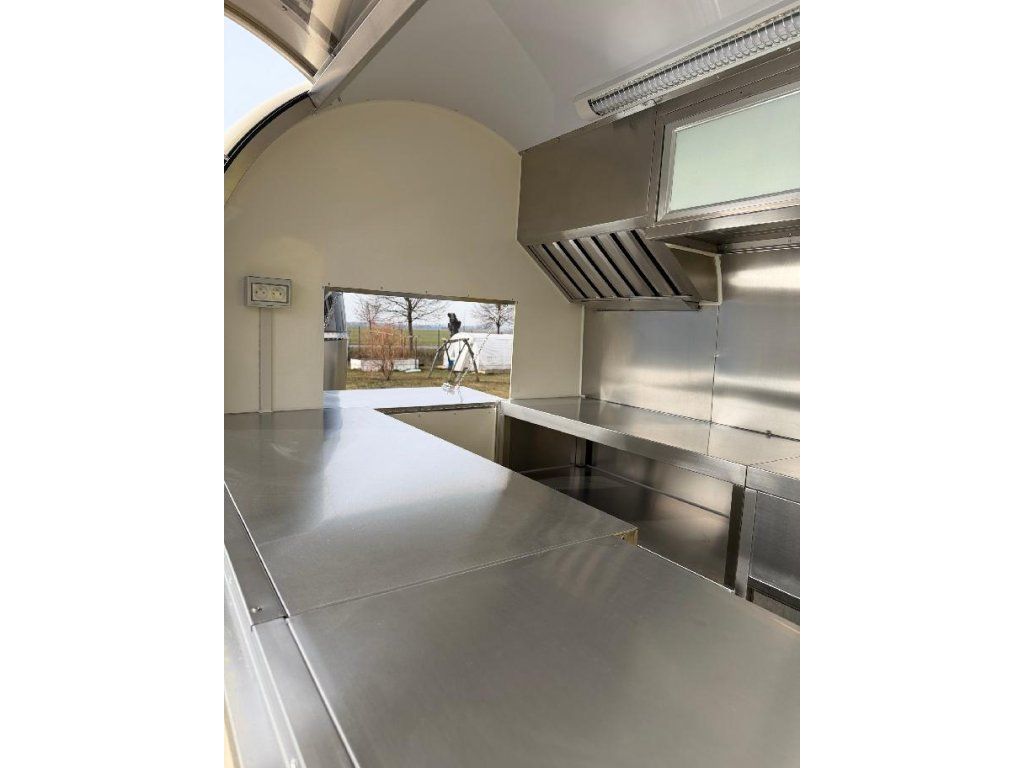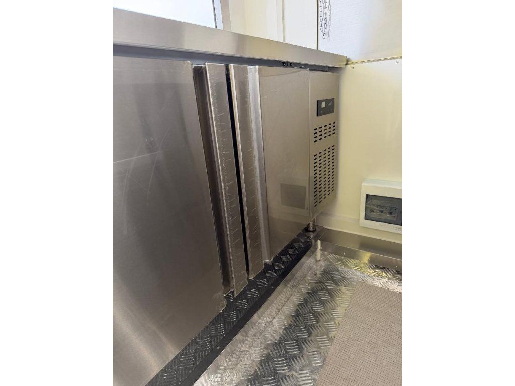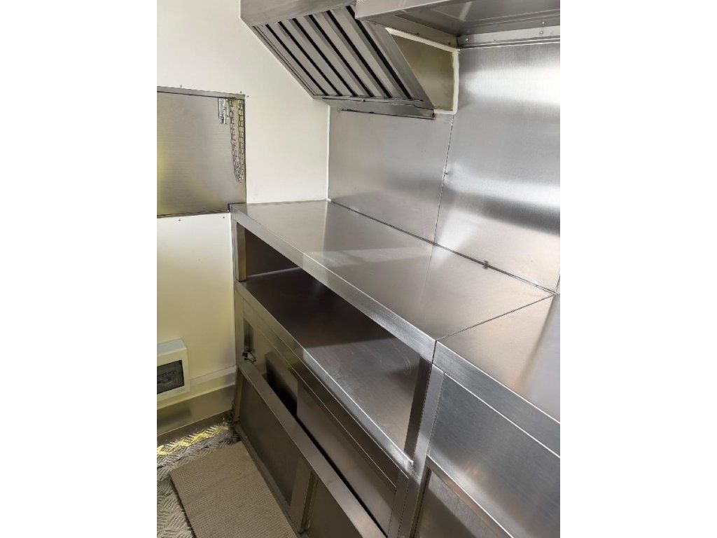 Čela z akryl laminátu, plášť sendvičová struktura obsahující tepelně izolační a nehořlavý materiál. Velké servisní podsvícené okno, malé boční okénko a zamykatelné boční dveře. Vnitřní pulty a police nerez, rozvod elektro 220V s vnějším připojením, el. zásuvka na peníze, el. pumpa na vodu, dřez, vlastní nádrže voda /odpad 15 - 20 l. Lednice, digestoř, variabilní pracovní plocha, gastro vybavení.
