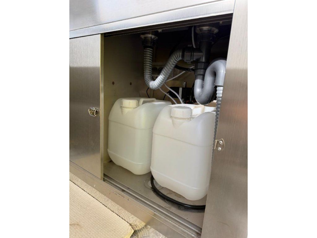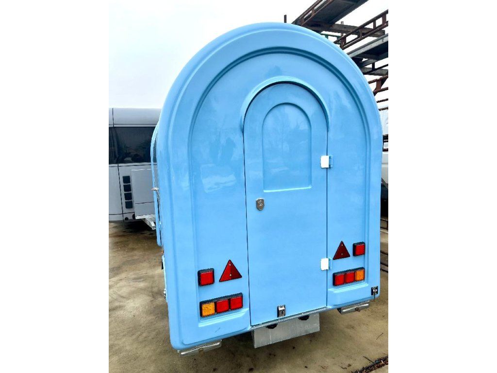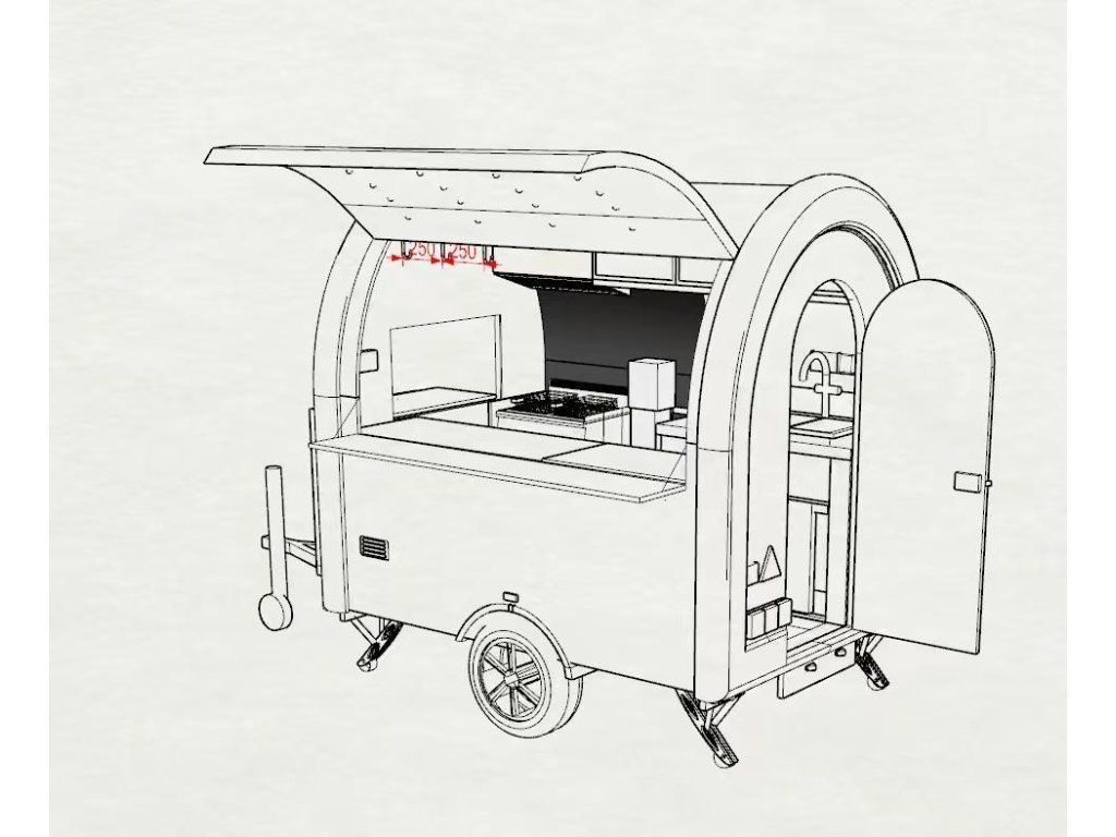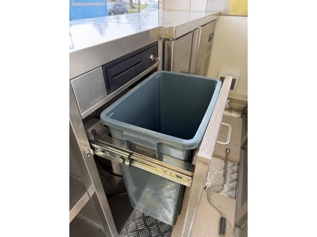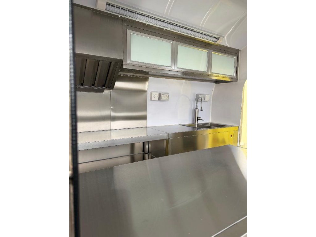 Čela z akryl laminátu, plášť sendvičová struktura obsahující tepelně izolační a nehořlavý materiál. Velké servisní podsvícené okno, malé boční okénko a zamykatelné boční dveře. Vnitřní pulty a police nerez, rozvod elektro 220V s vnějším připojením, el. zásuvka na peníze, el. pumpa na vodu, dřez, vlastní nádrže voda /odpad 15 - 20 l. Lednice, digestoř, variabilní pracovní plocha, gastro vybavení.