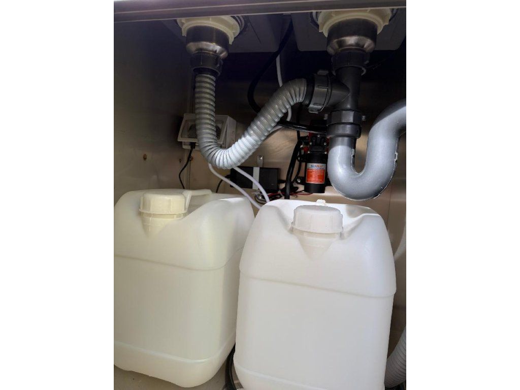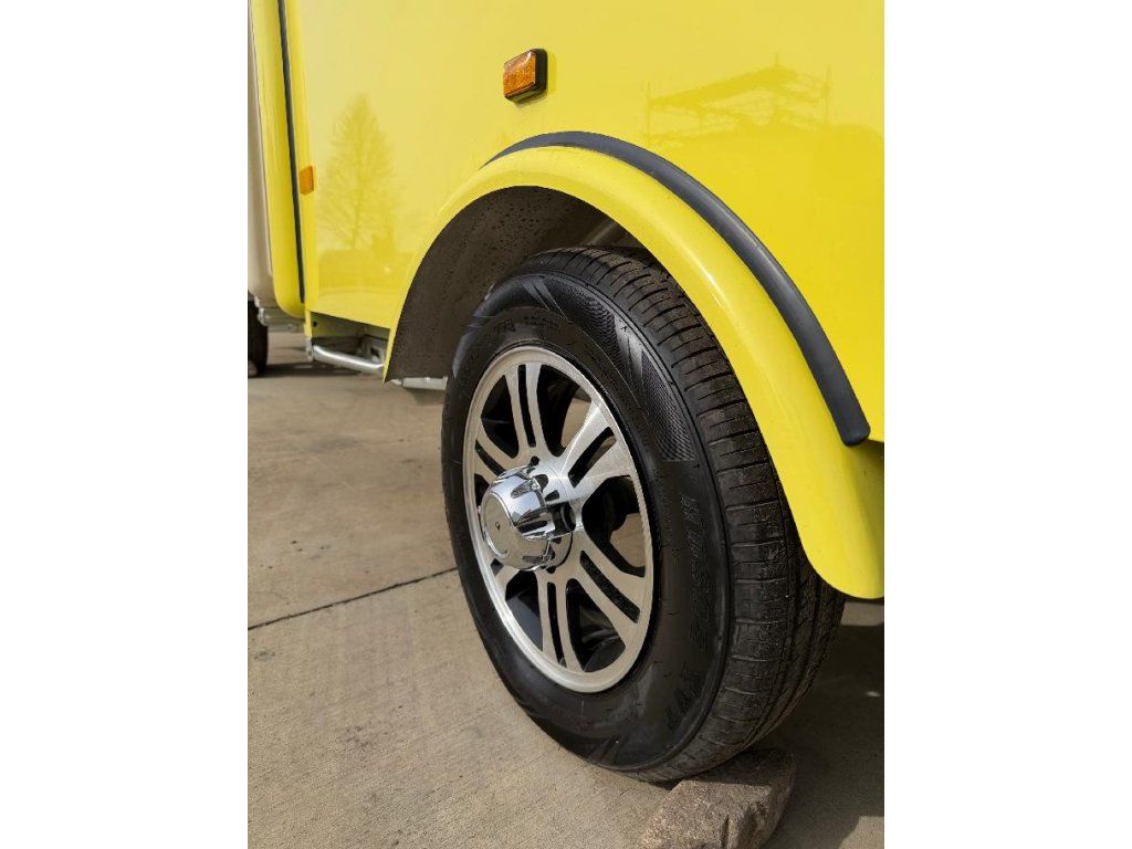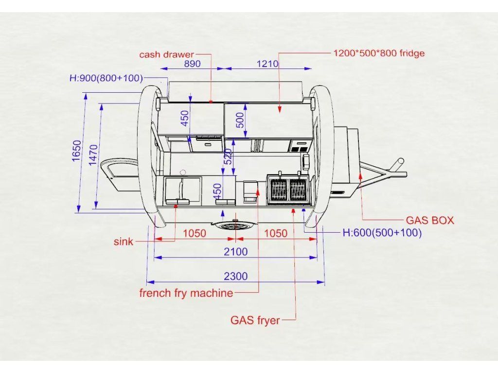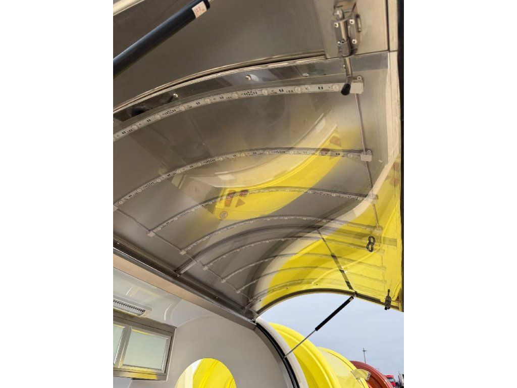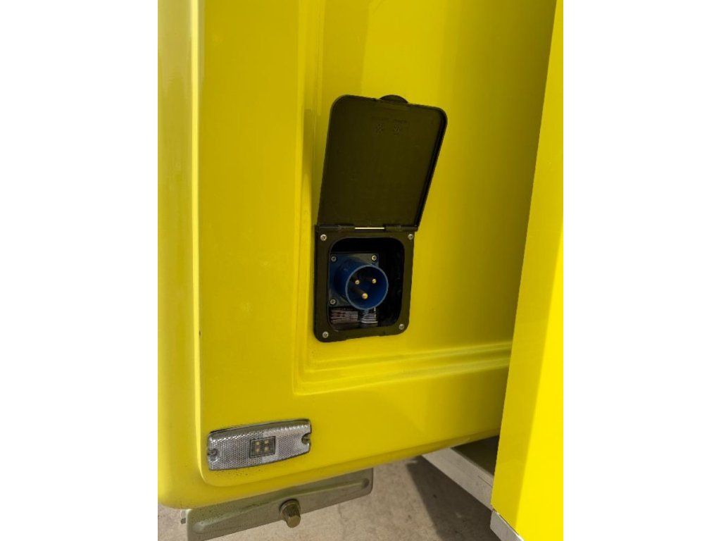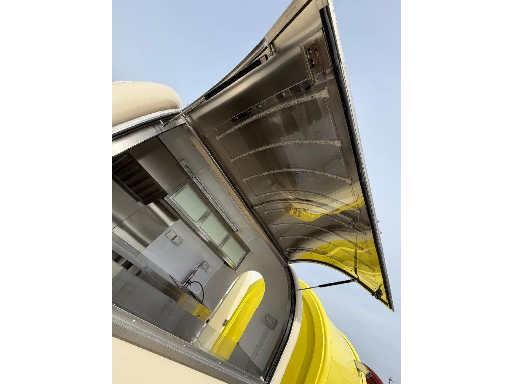 Čela z akryl laminátu, plášť sendvičová struktura obsahující tepelně izolační a nehořlavý materiál. Velké servisní podsvícené okno, malé boční okénko a zamykatelné boční dveře. Vnitřní pulty a police nerez, rozvod elektro 220V s vnějším připojením, el. zásuvka na peníze, el. pumpa na vodu, dřez, vlastní nádrže voda /odpad 15 - 20 l. Lednice, digestoř, variabilní pracovní plocha, gastro vybavení.