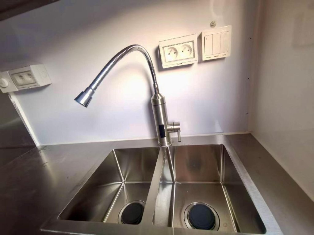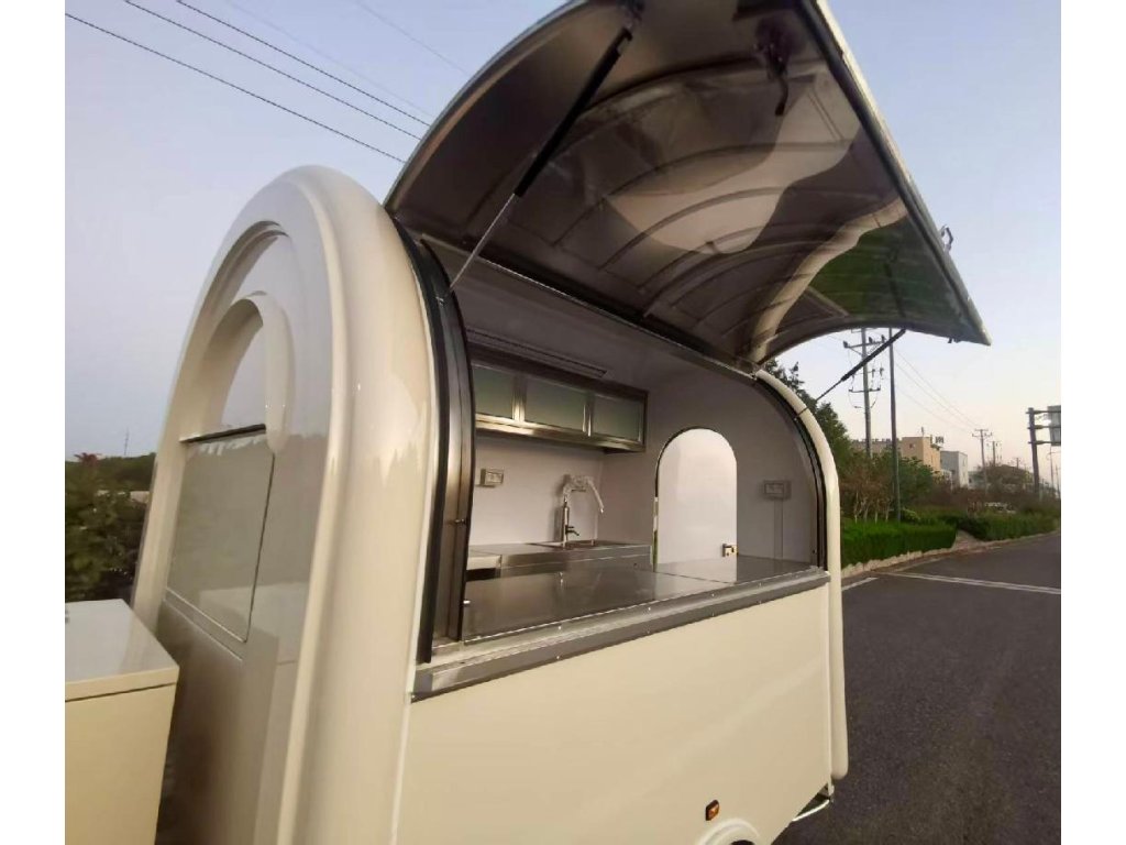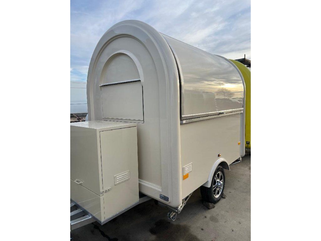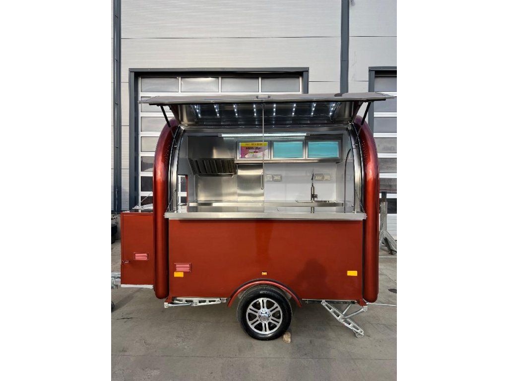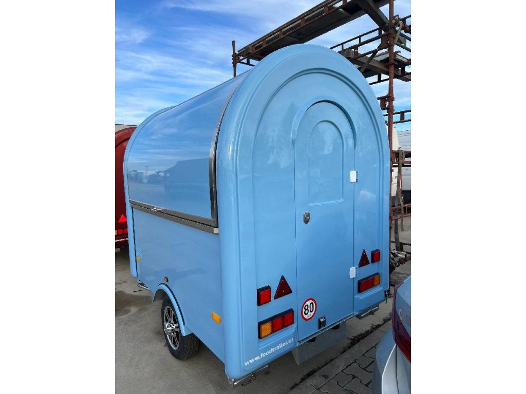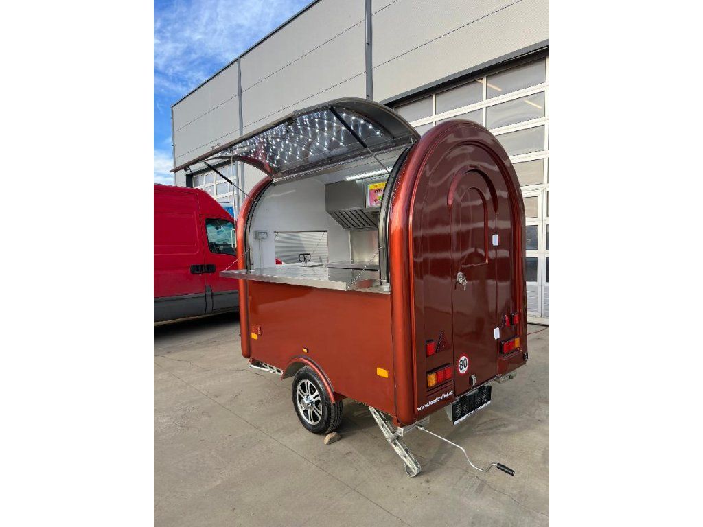 Čela z akryl laminátu, plášť sendvičová struktura obsahující tepelně izolační a nehořlavý materiál. Velké servisní podsvícené okno, malé boční okénko a zamykatelné boční dveře. Vnitřní pulty a police nerez, rozvod elektro 220V s vnějším připojením, el. zásuvka na peníze, el. pumpa na vodu, dřez, vlastní nádrže voda /odpad 15 - 20 l. Lednice, digestoř, variabilní pracovní plocha, gastro vybavení.Podvozek jednonápravový - komponenty ALKO - Germany.Homologace pro provoz na českých komunikacích,OR + přihlášení CZ SPZ, povinné ručení v ceně.